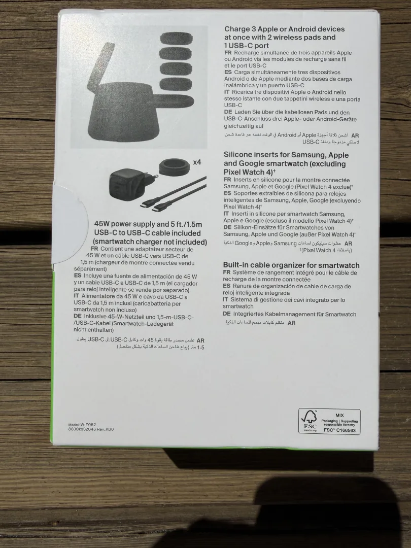 Le pad principal délivre jusqu’à 25W via la norme Qi2 pour les smartphones compatibles comme l’iPhone 17. La surface supérieure pour les écouteurs fonctionne en Qi standard à 5W, suffisant pour les AirPods Pro 2e génération. Le port USB-C dédié à la montre connectée délivre jusqu’à 10W, la vitesse effective dépendant du chargeur propriétaire de la montre.