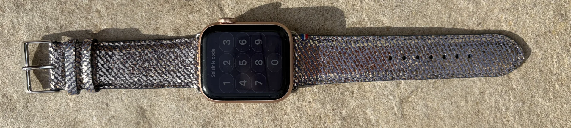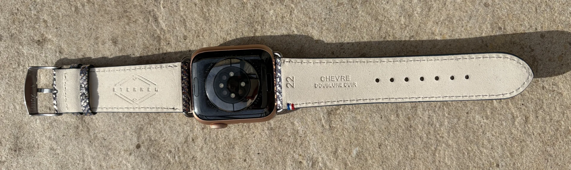 Le bracelet mesure 22 mm de large et s’adapte aux Apple Watch de 42 mm, 44 mm et 45 mm. Il se fixe à la montre via un système d’attaches rapides en acier inoxydable. Ces connecteurs permettent de changer de bracelet en quelques secondes, sans outil ni manipulation complexe. La boucle ardillon traditionnelle assure une fermeture fiable, avec sept trous de réglage espacés pour s’adapter à différents tours de poignet.