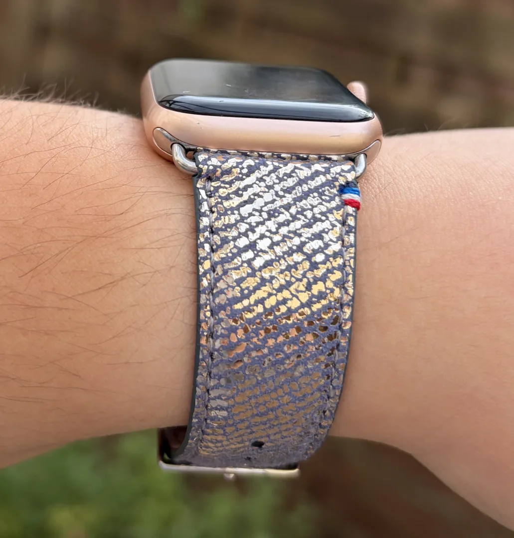Le bracelet Nuit Parisienne adopte un design audacieux avec son effet jean pailleté. Cette finition combine un fond bleu-gris rappelant le denim avec des reflets dorés et argentés qui évoquent les lumières nocturnes de la capitale. Le résultat visuel est surprenant sans être tape-à-l’œil. Cela change des bracelets unis classiques.