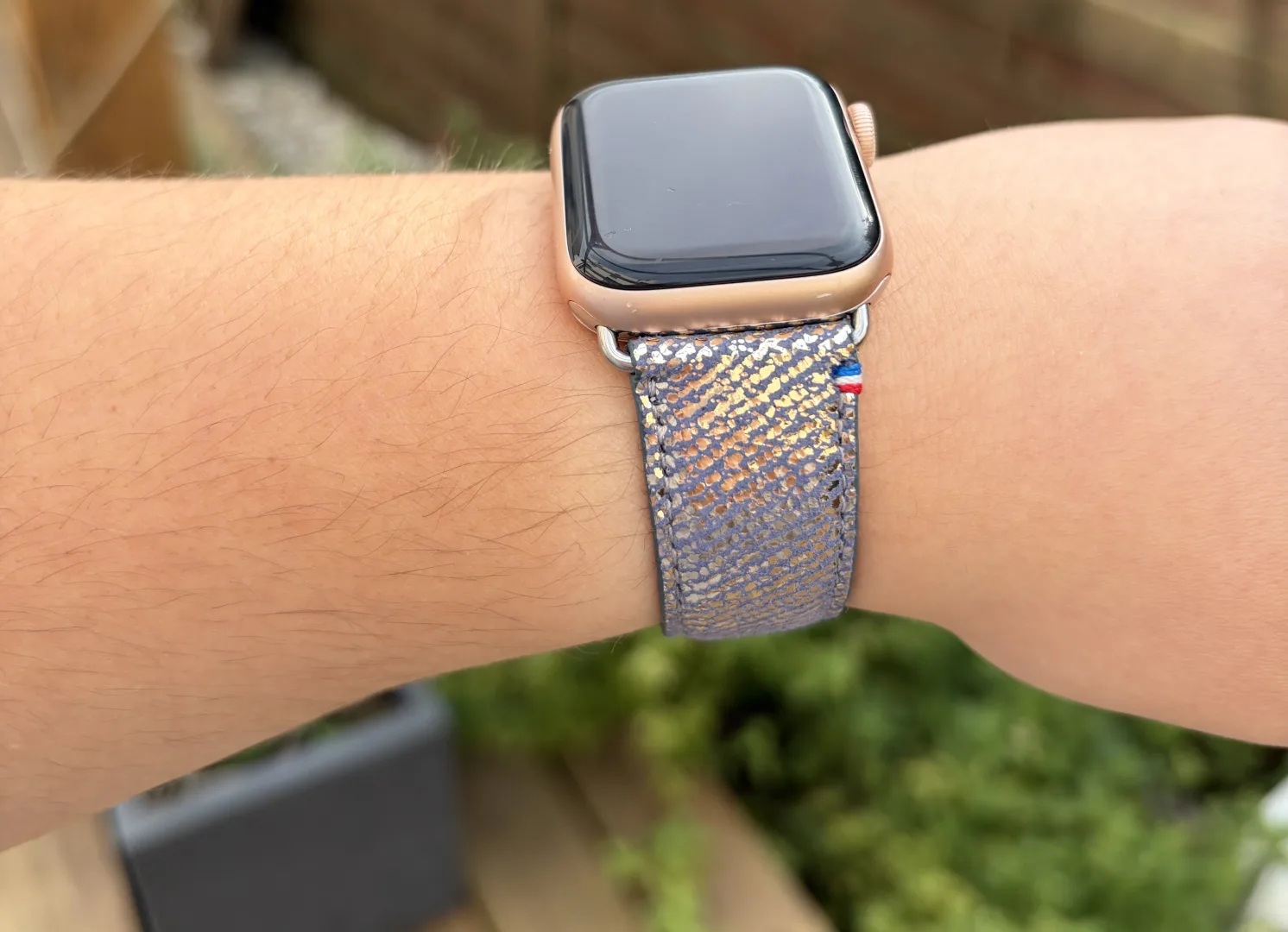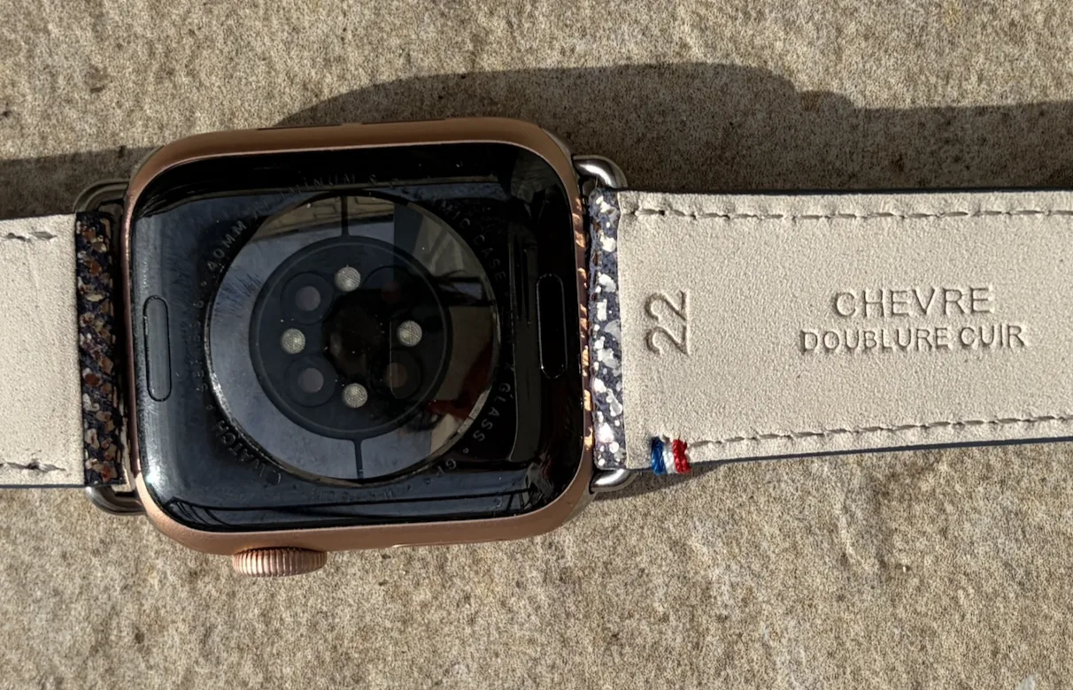 Le bracelet Aquarelle existe en version « petite taille » adaptée aux Apple Watch de 38 mm, 40 mm et 41 mm. Cette déclinaison répond aux besoins des poignets fins ou des personnes préférant les montres de format compact. La largeur de 20 mm s’harmonise parfaitement avec les proportions de ces boîtiers, créant un équilibre visuel cohérent. Le système de fixation reprend le même mécanisme que le modèle Nuit Parisienne, garantissant une compatibilité totale avec tous les modèles d’Apple Watch concernés.