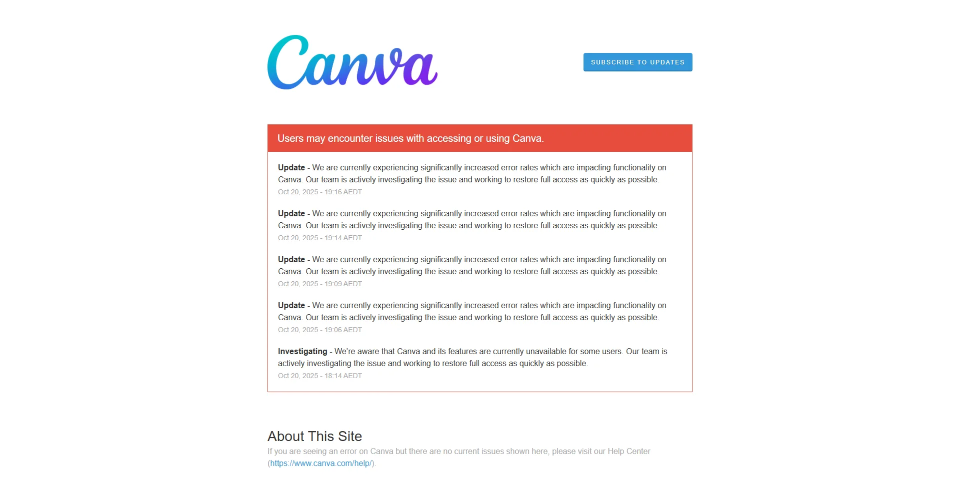 Le service de graphisme en ligne et sur application mobile Canva ne fonctionne plus en ce lundi 20 octobre 2025, depuis ce matin. Voici ce qu’il se passe sur Canva et quelles sont les autres plateformes Internet touchées par cette panne mondiale.