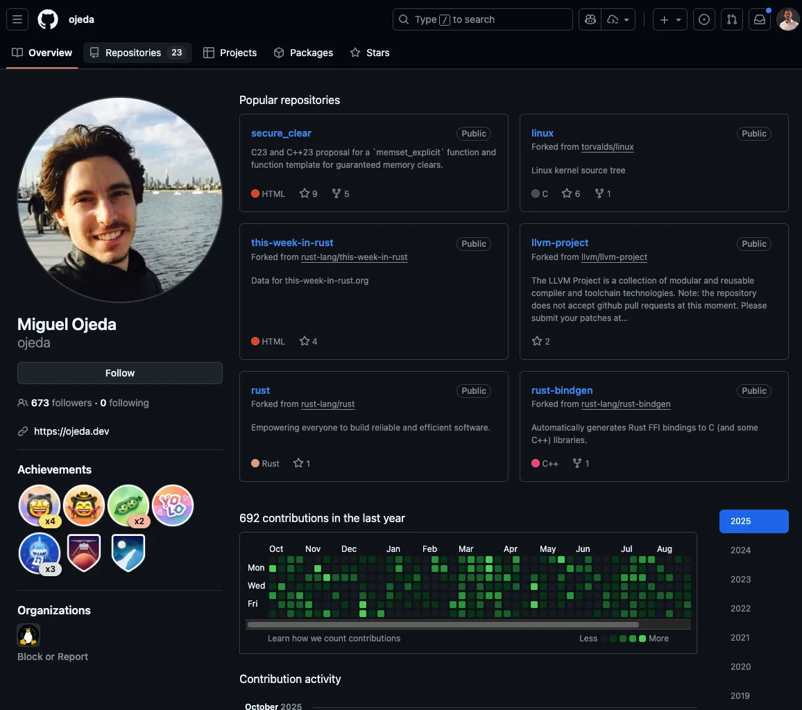 Miguel Ojeda, responsable du projet Rust for Linux, a publié en février 2025 une « politique du noyau Rust » pour clarifier les règles de cohabitation. Ce document vise à rassurer les contributeurs Rust et à définir les attentes des deux côtés.