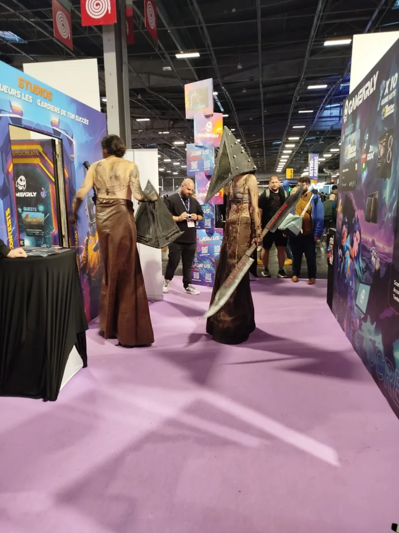 Au-delà des jeux, la Paris Games Week célèbre la passion des fans à travers le cosplay. L’espace dédié présentait des créations spectaculaires, dont une armure complète de Fallout (Power Armor) fidèlement reconstituée, des costumes médiévaux d’une qualité remarquable, et même un Pyramid Head grandeur nature issu de la franchise Silent Hill.