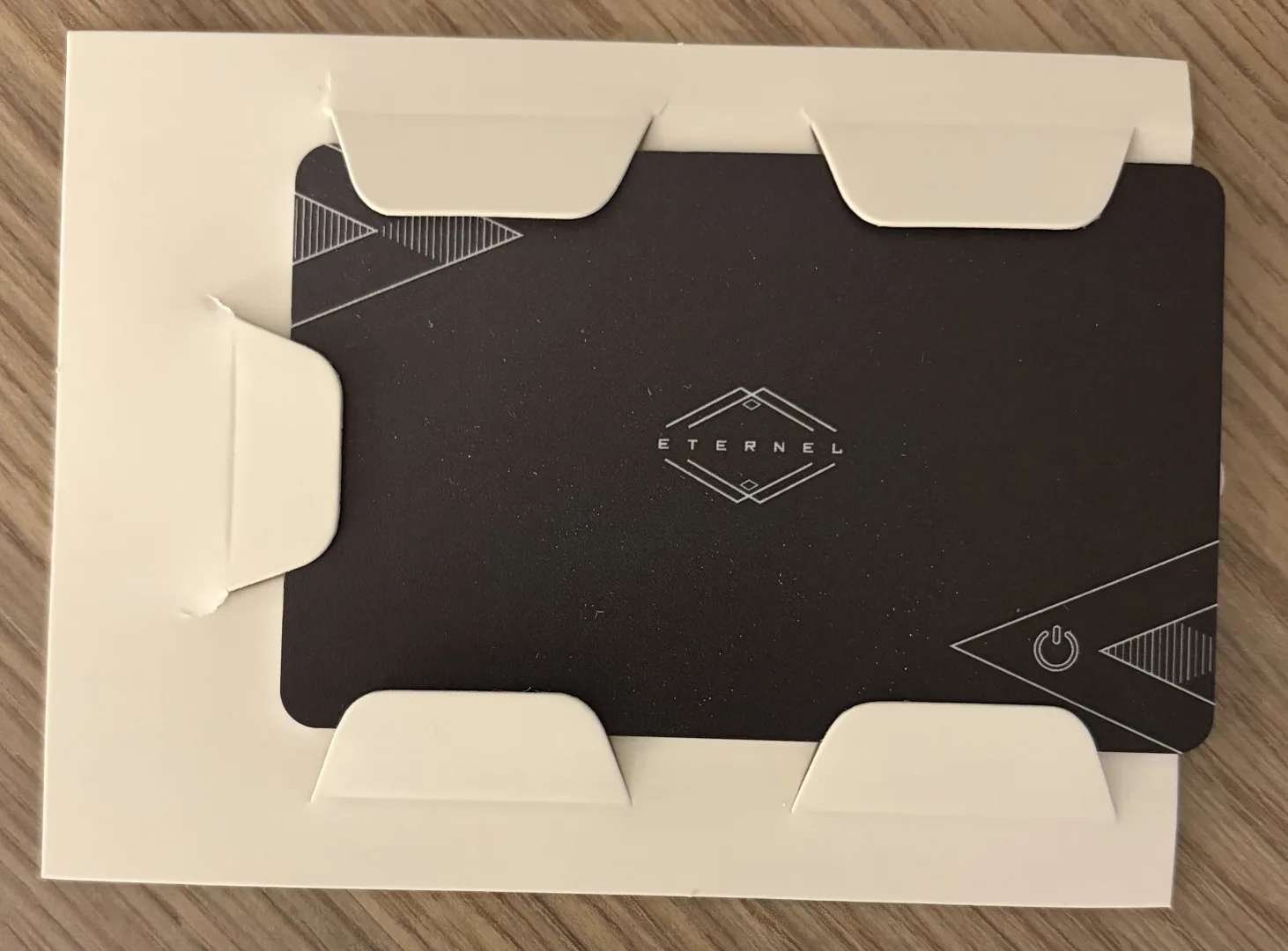 Le produit se présente sous la forme d’une carte au format bancaire, avec un revêtement anthracite sobre rehaussé de détails graphiques discrets. Le logo Eternel apparaît sur la face avant tandis qu’un pictogramme à l’arrière indique la zone de recharge sans fil. L’emballage est soigné, avec un packaging minimaliste typique des produits premium.