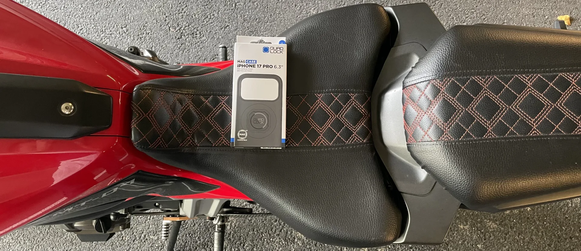 boîte quad lock iPhone 17 pro à côté du support officiel sur Yamaha MT-07