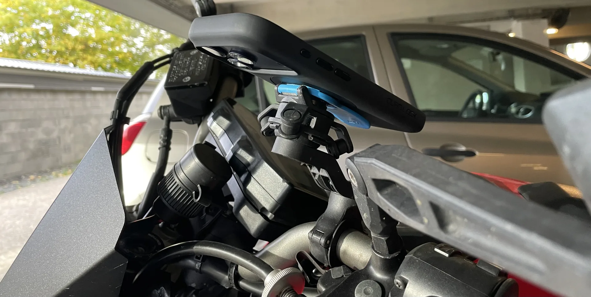 Les vibrations moto peuvent endommager définitivement les systèmes de stabilisation optique des caméras iPhone. Apple a d’ailleurs émis des avertissements officiels à ce sujet. Pour cette raison, j’utilise systématiquement le Vibration Dampener de Quad Lock, qui s’intercale entre le support et le téléphone.