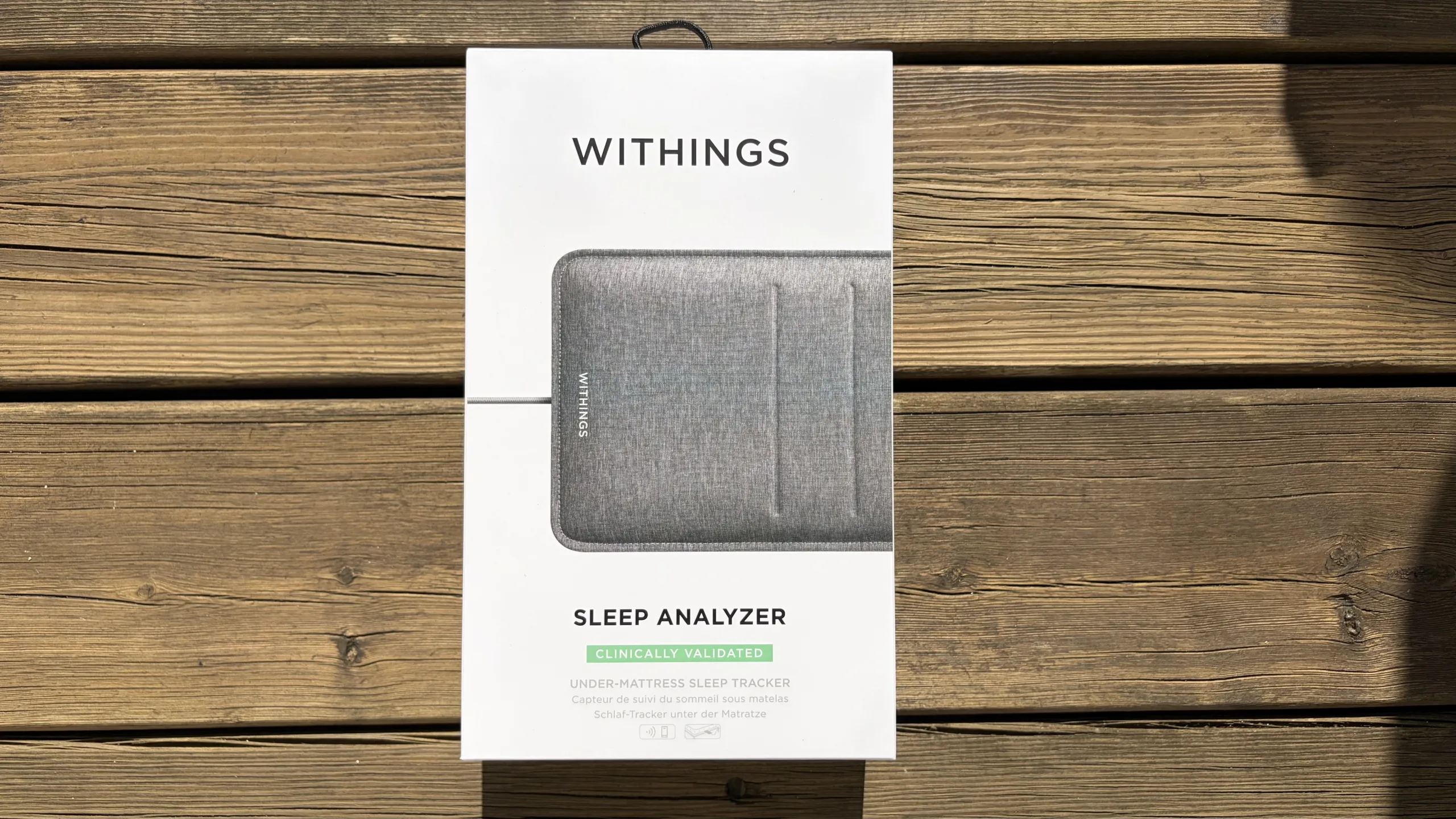 La boîte du Sleep Analyzer adopte le même minimalisme blanc que le reste de la gamme Withings. La face avant affiche le capteur en photo avec la mention « Clinically Validated » en évidence sur un badge vert, ce qui annonce d’emblée le positionnement médical du produit. Au dos, on aperçoit une capture de l’interface de l’application avec les données de sommeil et les icônes Wi-Fi et Bluetooth.